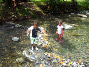 Otro lugar en donde se puede entretener a los niños y aventurar con ellos es en el río, un lugar rodeado de naturaleza. A diferencia de la playa donde encontramos la arena, sol y agua salada, los ríos son más refrescantes por los árboles que los rodean, el agua dulce y fría. Casi todo los ríos estan formados por rocas de diferentes tamaños cuya formación  hace  charcos de diferentes tamaños y profundidad. Los ríos son lugares perfectos para explorar y mostrar agilidad entre la corriente del agua y las rocas. La buena selección de área sería en zonas llanas o de poca profundidad, es bueno así para crear mini campamentos con sillitas y para acomodar las cosas  para merendar.