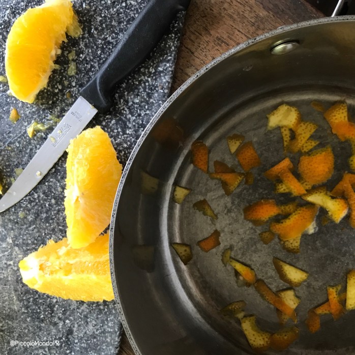 Lava y pela las naranjas. Quita toda la parte blanca y las semillas. Corta la piel en tiras finas y añádela a la pulpa.