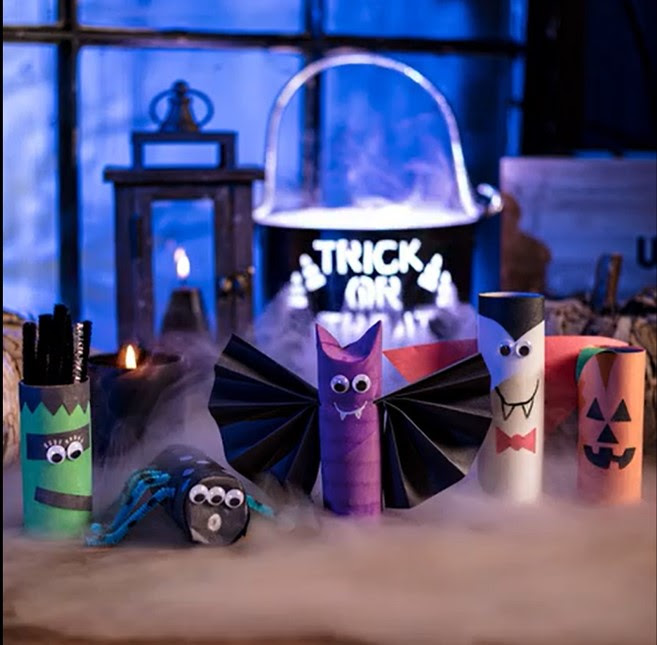 Material: rollo de cartón del papel higiénico, pintura témpera lavable, pincel, papel construcción, tijeras, cinta adhesiva, ojos para decorar, pegamento y plumones.
