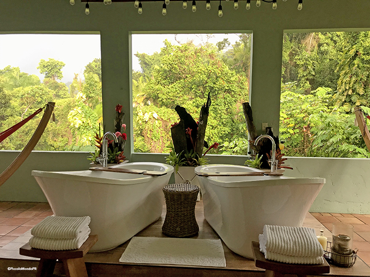 Nuestra villa fue The Jungle Suite, una habitación equipada con nevera, fregadero y sala. Tiene una cama colgante y baño con ducha. Lo más que me encantó de esta habitación fue el balcón privado con dos tinas con vista al bosque… el lugar perfecto para relajarse y pasarla bien. El espacio está bellamente decorado con flores tropicales, tiene dos hamacas y cuenta con lo esencial para relajarte en un baño de burbujas.