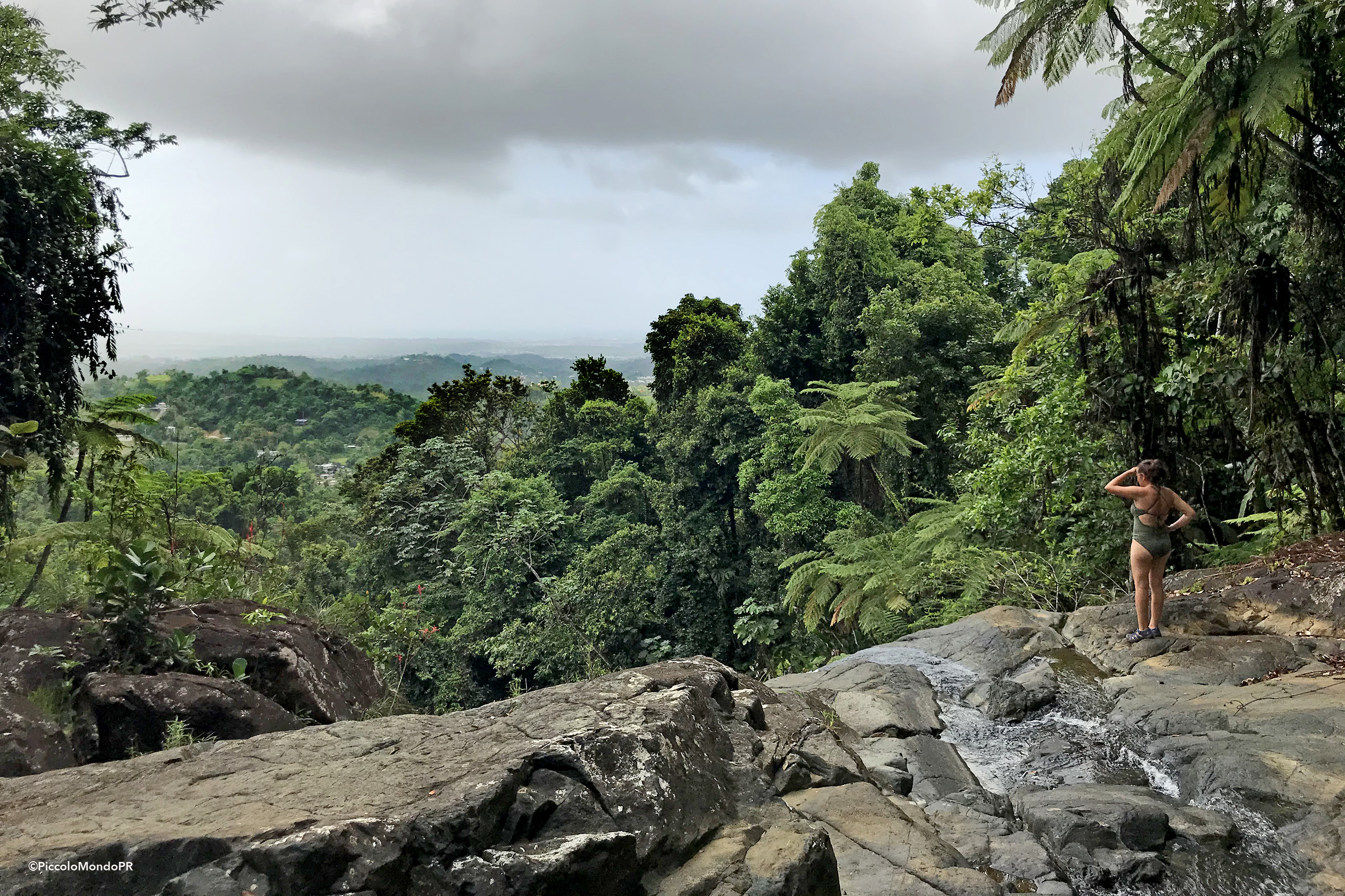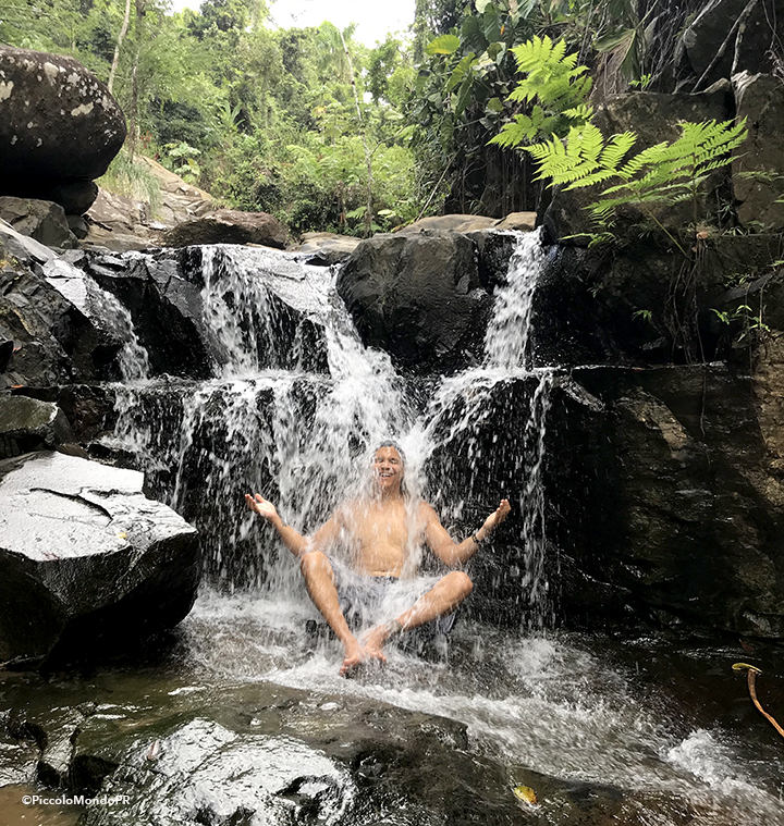 Al llegar al lugar aprovechamos para dar una caminata al bosque, explorar las cascadas y las piscinas naturales en la finca privada. Tomamos el sendero llamado «Lost Machetes Hike». Entrando al bosque entre bellas heliconias, y suelo cubierto de plantas tropicales, vimos un San Pedrito y varios cauces del río, que en ese momento estaban secos. Caminamos casi 45 minutos para llegar a uno de los lugares escénicos más llamativos del área. Nos refrescamos en cascada y disfrutamos de la vista escénica de la región. Hay otra cascada más alta pero no nos daba tiempo de hacer la caminata antes de que cayera la noche.