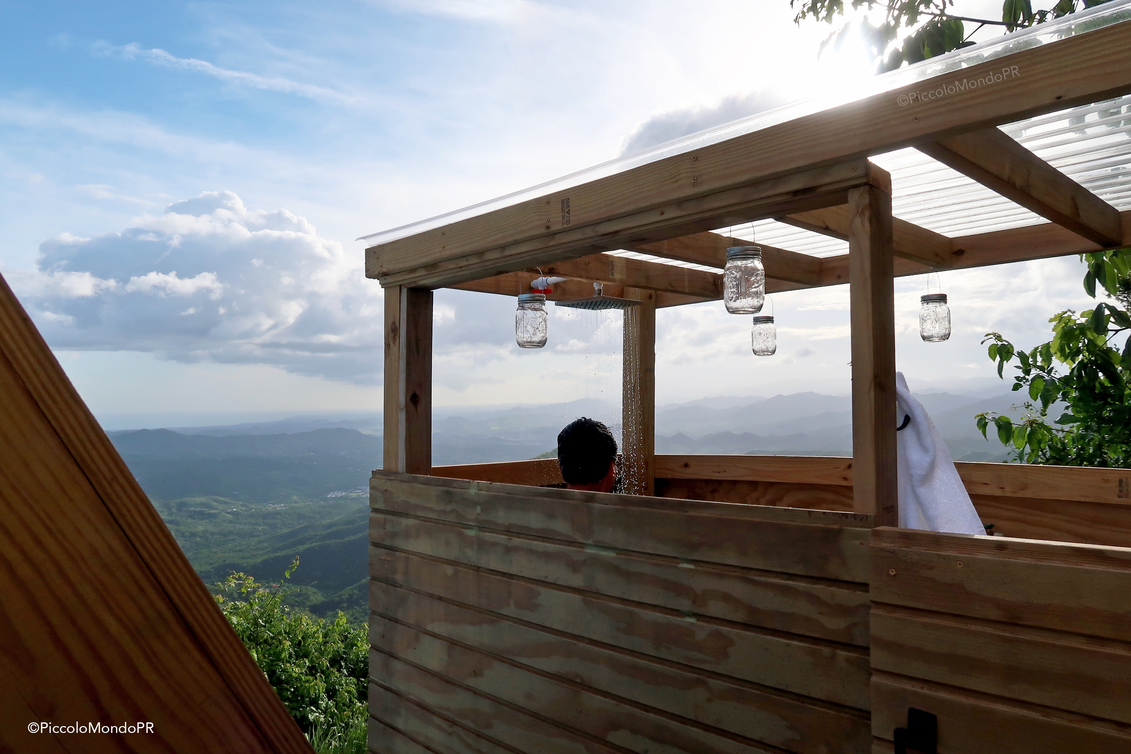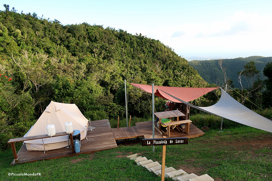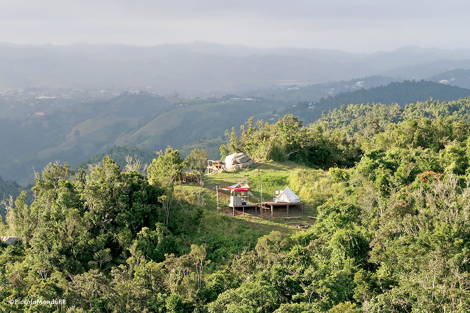 Subiendo la montaña más alta de Aibonito, llamada Cerro el Verdún, en la localidad conocida como la cuchilla, Sebastián, nos llevó a explorar su nuevo proyecto de camping en su finca con una ubicación privilegiada. Se trata de un paraíso en la cima de las montañas donde Sebastián García construyó una serie de plataformas de madera en las que montó dos casetas de canvas con vistas impresionantes a las montañas y la costa sur desde Guayama a Ponce.