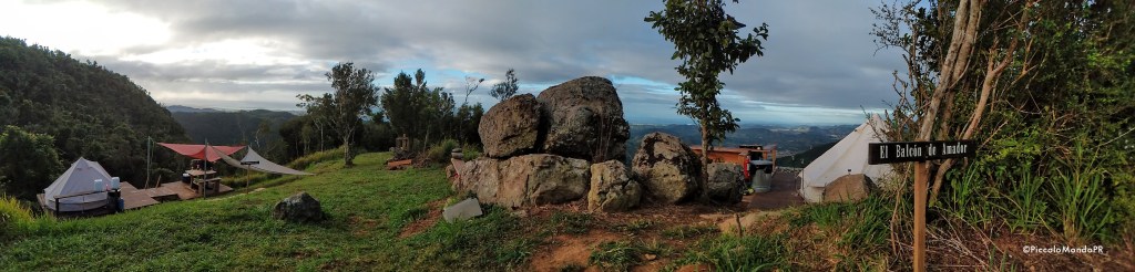 Cuando fuimos caminando para ver la primera plataforma y caseta, rotulada como El Balcón de Amador, sentí que estaba en otro país de lo impresionante que se veía la escena. Al lado del tablado con la caseta hay una gran piedra grande bien llamativa y curiosa. La plataforma tiene un barandal de madera con BBQ, reserva de agua, espacio para sentarte con mesa y una superficie de soga frente a la caseta que sirve para acostarse y sentir que flotas en el aire. Debajo de la plataforma hay un banco de madera sujetado por cadenas en el que dos personas pueden columpiarse. La vista a los montes de Coamo, Salinas y Santa Isabel y de la costa sur de Puerto Rico es una maravilla.