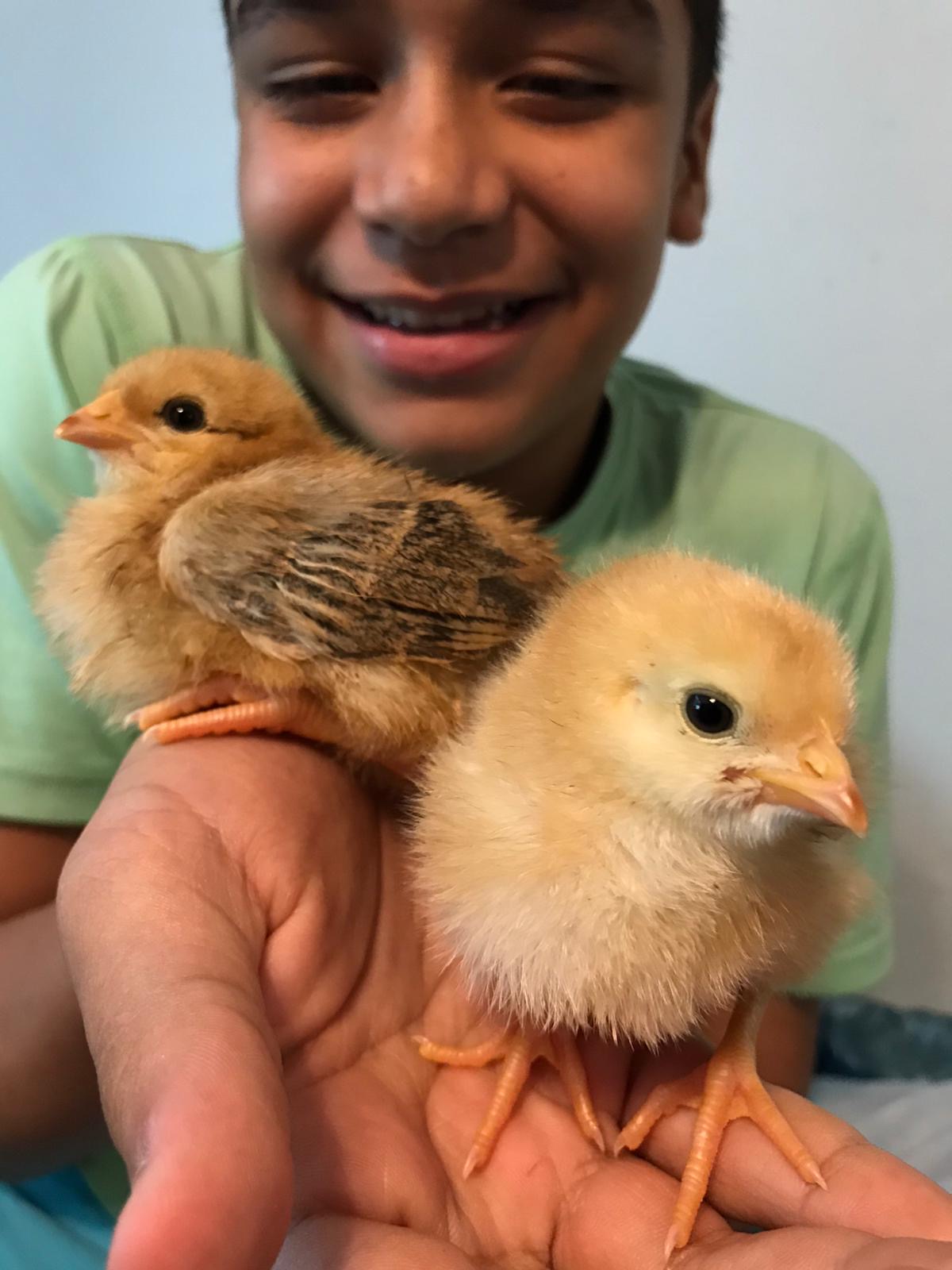 Dos nuevas integrantes llegaron a nuestra familia, unas poliitas a quienes bautizamos Meli y Lola. Estando en casa todos, Mariel trabajando, los nenes sin ir a la escuela, y yo sin poder salir tampoco, la comida se acababa muy rápido así que la producción de huevos no era suficiente para nuestra alimentación. Por eso decidimos que era buena idea tener otras gallinas ponedoras. Las nuevas pollitas se convirtieron, además, en una forma de sobrellevar el tiempo en casa cuidando a nuestras nuevas mascotitas.