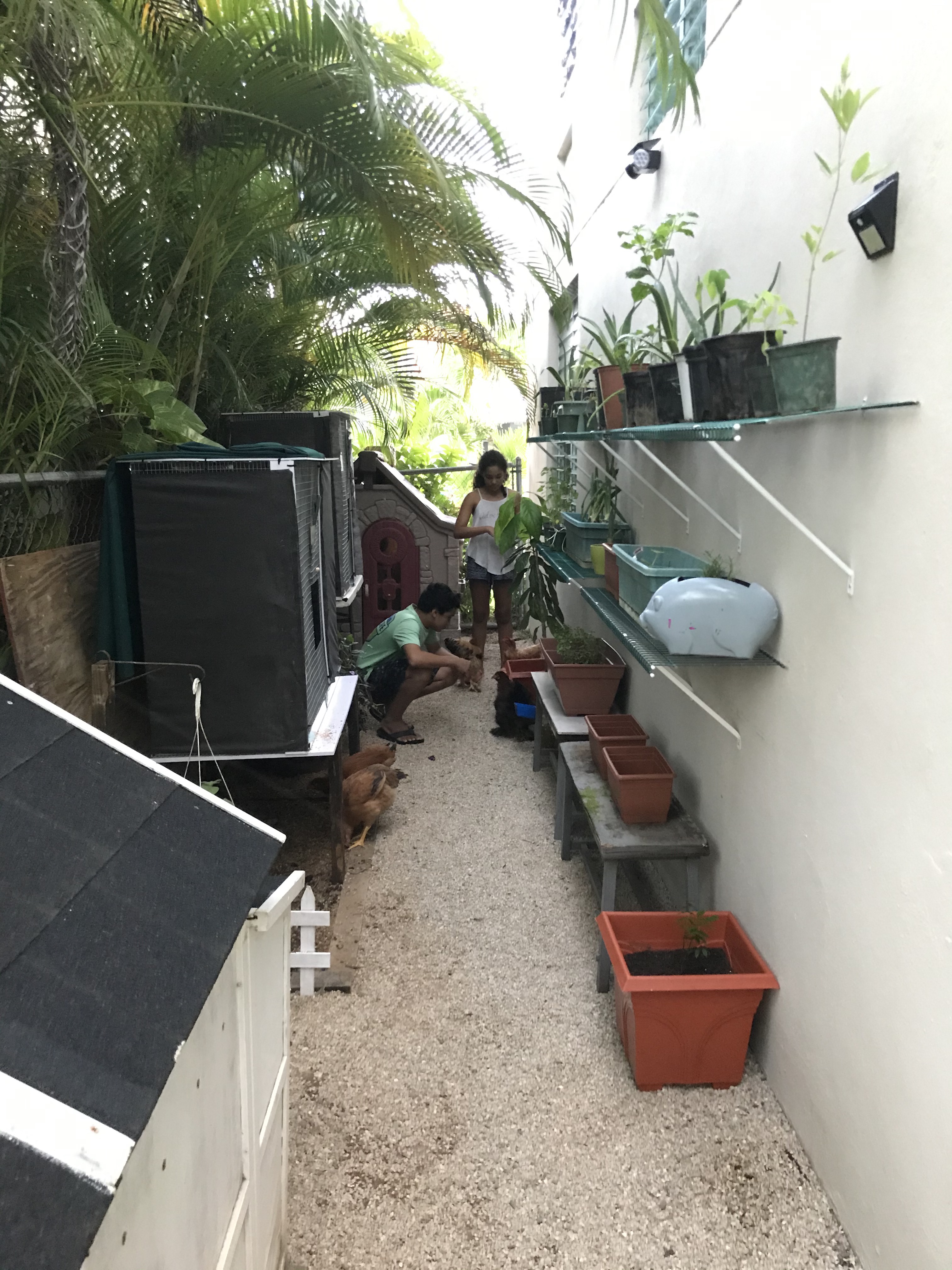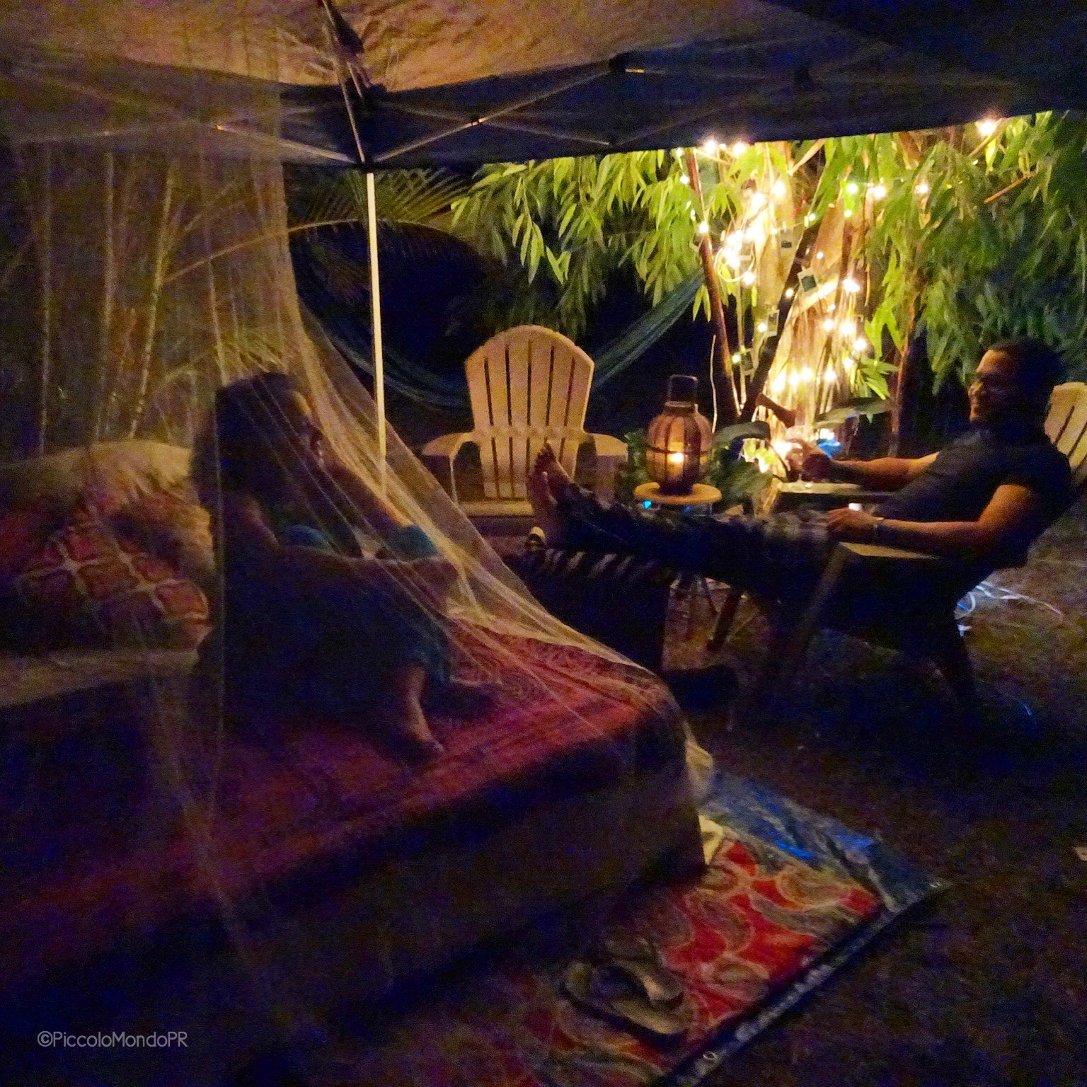 Buscando alternativas para despejarnos y entretenernos en el hogar, empezamos la tarea de restaurar nuestro patio, el cual habíamos abandonado luego del huracán María. Habíamos perdido árboles y plantas y tuvimos un deslizamiento de tierra en el patio a causa del huracán. Trabajar en la restauración del patio se convirtió en un entretenimiento. Mariel (MamáPiccolo) empezó a crear ideas para el patio. Nos manteníamos trabajando en el patio casi todos los días. Hasta revivimos un área que no usábamos y creamos un spot romántico donde hicimos glamping y cine al aire libre. Montamos un gazebo y lo adornamos con bombillas. Mariel montó un estanque e hizo un jardín con escaleras de madera.