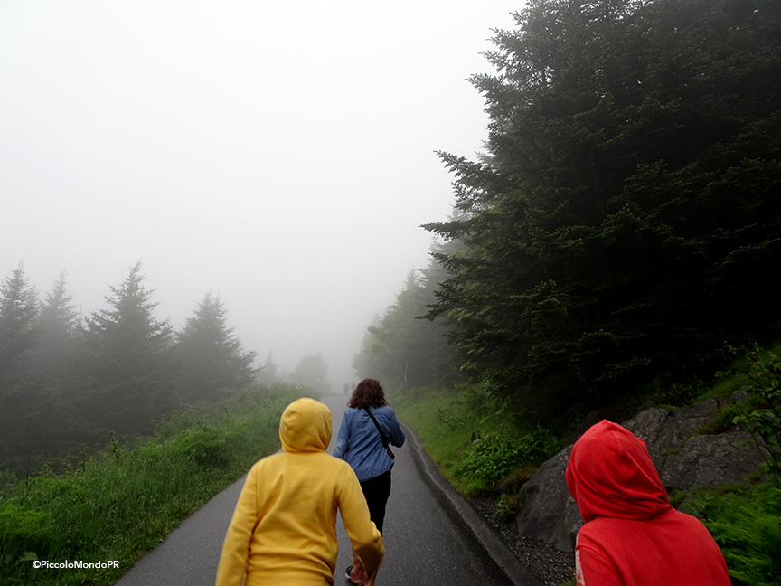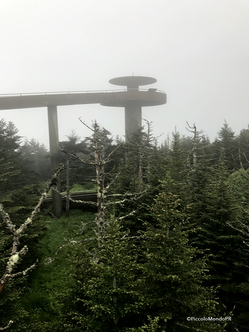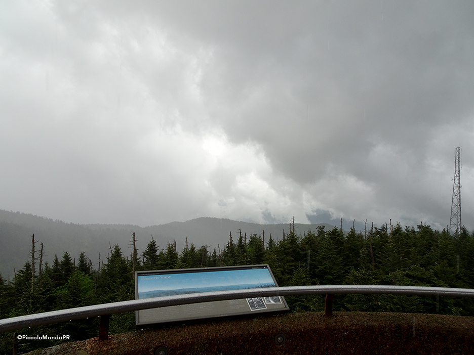 En días despejados, las vistas se expanden más de 100 millas. Desafortunadamente, la contaminación del aire a menudo limita las distancias de visualización a menos de 20 millas. Para nuestra suerte nos tocó una tormenta cuando subimos hacia la torre de observación. Esa tormenta nunca la vamos a olvidar. Nos mojamos y cuando llegamos a la torre empezó un evento de lluvia más fuerte con truenos y relámpagos. Estuvimos atrapados allí como media hora y no pudimos ver la vista de montañas, solo las nubes. Las nubes, la precipitación y las bajas temperaturas son comunes en Clingmans Dome. Las temperaturas en el domo pueden ser de 10 a 20 grados Fahrenheit más frías que en las tierras bajas circundantes.