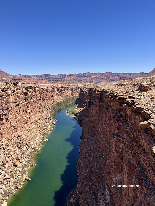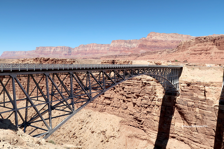 El puente Navajo hace referencia a una pareja de puentes en arco de acero que cruzan el río Colorado cerca de Lee’s Ferry, en el norte de Arizona. El puente más nuevo del par soporta el tráfico de vehículos. Llegamos aquí por suerte, por la ruta que nos trazo el GPS de Utah a Arizona. El puente tiene una altura impresionante por sobre el río. Es un espectáculo apreciar la ranura del cañón.