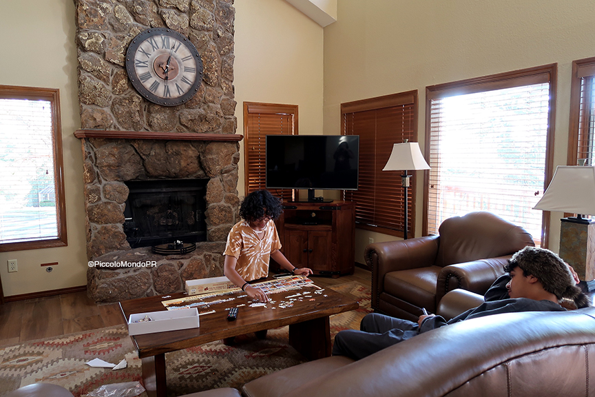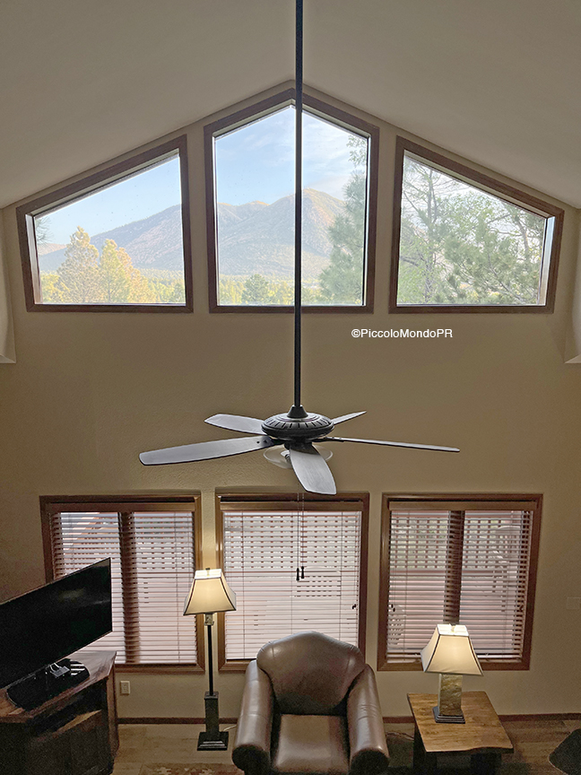Nos quedamos en un resort de cabañas tipo suite que tienen de uno a tres dormitorios y capacidad para cuatro a seis huéspedes. Su tamaño varía de 460 a 963 pies cuadrados. Tiene habitaciones separadas, una cocina completa y la comodidad de una lavadora/secadora en cada suite. También tiene balcón con un jacuzzi, chimenea, espaciosa sala y comedor independiente. Su ubicación nos permitía apreciar el paisaje de la montaña Elden desde el balcón. Las comodidades del resort, incluyen tres piscinas al aire libre, ocho canchas de tenis, un jacuzzi al aire libre, área de juegos para niños, campo de práctica, centro de negocios y fitness, y una sala de juegos. Es un lugar semi-céntrico para visitar lugares turísticos de Arizona. Está a 45 minutos de Sedona, 1 hora del Grand Canyon y 45 minutos del parque Bearizona. TimeShare Club Wyndham Flagstaff