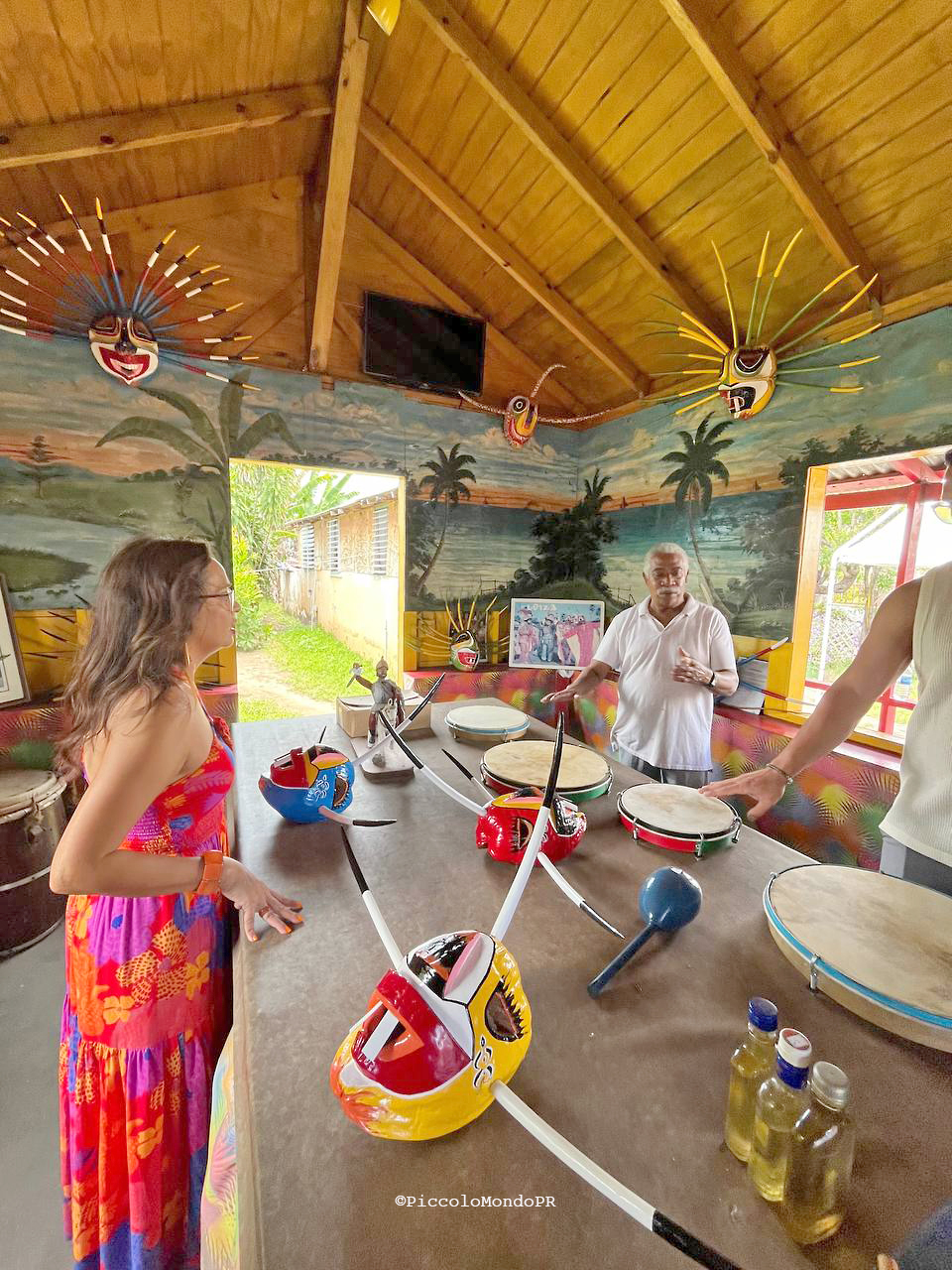 Nuestra tercera parada fue a pasos del estudio de Samuel Lind para visitar el taller de Artesanías Castor Ayala. Nos recibió Don Raúl Ayala quien es hijo del fenecido Castor Ayala, patriarca de la familia Ayala y maestro artesano de máscaras y objetos de coco, bambú e higuera. Don Castor mantuvo un importante taller donde confeccionaba diversos objetos como máscaras de vejigantes hechas de coco y muñecas y vasos de higuera. Cuando llegamos al lugar encontramos a su hijo Don Raúl en pleno proceso de producción, pintando unas máscaras que había confeccionado. Nos llevó al interior de la colorida casita adornada de murales pictóricos de paisajes pintados por Don Castor Ayala en los años de 1950. En la casita se exhiben las máscaras de vejigantes y diversos objetos tallados por Don Castor y memorabilia como reportajes y carteles sobre el maestro artesano. Además, se muestran diferentes máscaras de coco realizadas por Don Raúl. Él nos dio una charla demostrativa de las etapas de la confección de las máscaras de coco y eso nos permitió conocer el arduo trabajo que requiere la confección de estos objetos. También nos habló sobre cómo su padre fundó el grupo de bomba Ballet Folkórico Hermanos Ayala, con todos su hijos e hijas, siendo este el primer grupo que llevó la bomba a los escenarios televisivos de Puerto Rico y logró proyección internacional. Es importante visitar este lugar ya que Don Raúl es el último de su familia que continúa haciendo las máscaras de coco y es una experiencia muy educativa hablar con él. En el patio frontal de su casa conocido como el batey de los Hermanos Ayala habrá una gran celebración este próximo 27 de julio de 2024 desde las 12:30 pm en conmemoración del 65 aniversario del Ballet Folklórico Hermanos Ayala. Para visitas a Artesanías Castor Ayala puede contactar al (787) 564-6403.