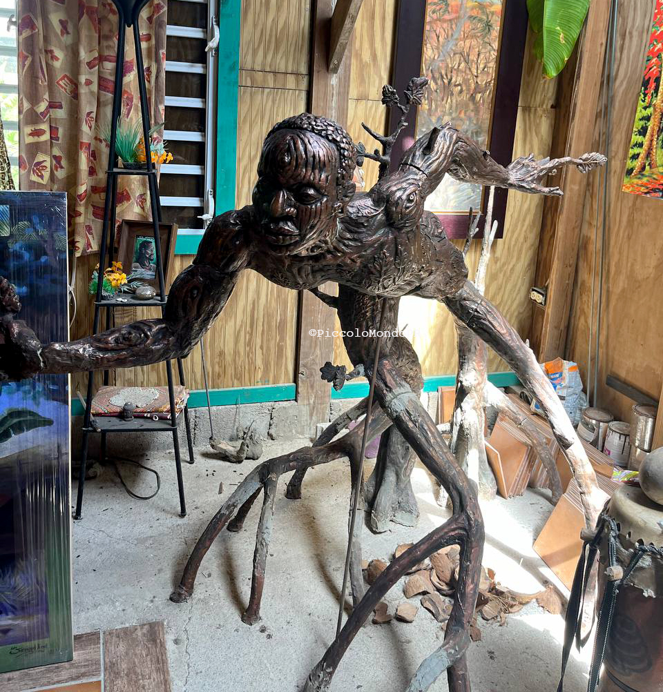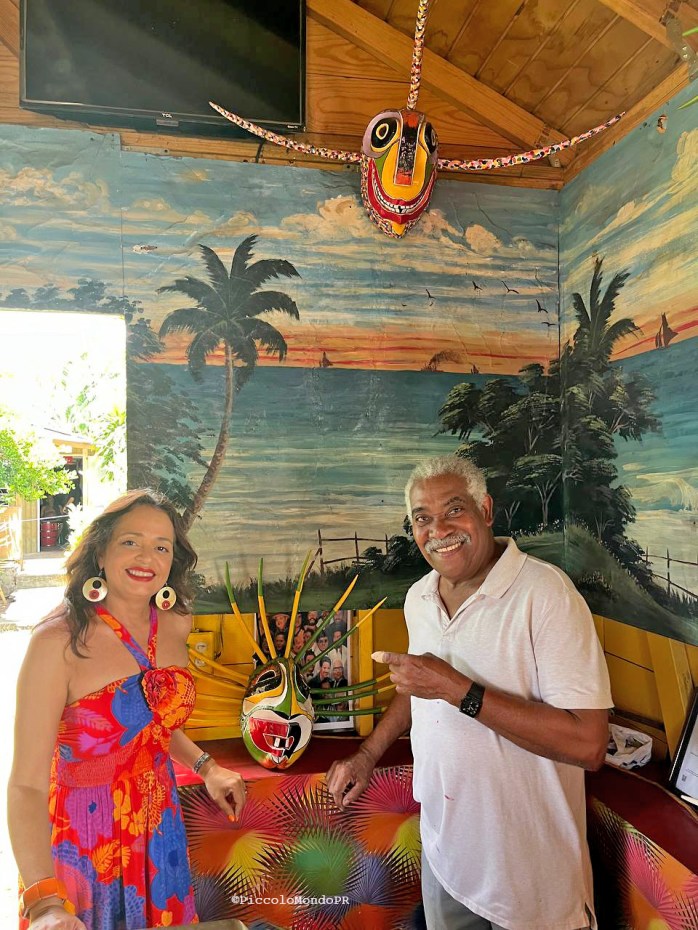 Seguimos el viaje al barrio Medianía Alta para visitar el estudio de Arte del artista Samuel Lind. No quiero dejar de mencionar que caminando hacia el estudio nos topamos con un vendedor en bicicleta de dulces de coco y de coco y piña. Los dulces hechos por él fueron una delicia, así que si se encuentran con él, compren y prueben sus dulces. La visita al estudio de arte de Samuel Lind es una experiencia extraordinaria para conocer más sobre las tradiciones e imágenes autóctonas de Loíza y adentrarse en el fascinante taller de trabajo de un artista dedicado a múltiples facetas creativas como la escultura, pintura y la impresión de carteles en serigrafía. Nacido en Loíza, Samuel Lind ha dedicado su vida a crear arte para exaltar la historia, personajes, tradiciones y el paisaje propio de su pueblo. Añadimos que Lind fue quien diseñó la bandera del pueblo de Loíza, diseño que en sus colores puede recordar los de la bandera de Ghana en África. La casa estudio de Samuel Lind es una revelación de su impresionante obra y de objetos históricos alusivos a Loíza y su pasado ancestral. Pudimos ver a Lind pintando en vivo una obra al óleo, dando trazos con sus pinceles a la figura de una majestuosa bailadora de bomba. El momento añadió un aura especial a nuestra visita. Allí Lind nos habló de su arte y nos mostró sus pinturas, esculturas y carteles. Una de las esculturas es el modelo de la obra monumental titulada Osaín, que es parte del Jardín Botánico y Cultural William Miranda Marín en Caguas. Esta impresionante escultura representa a un hombre negro convertido en árbol, con ramas saliendo de su cuerpo y sus piernas transformadas en raíces de mangle. Es una imagen de carácter mítico que conecta con la historia de Loíza. Entre pinturas de palmares, de la cacica Yuisa, de bailadoras de bomba, deidades de reminiscencia taína y máscaras de coco, máscaras africanas, barriles de bomba e infinidad de curiosidades que el artista ha coleccionado, Lind dio toques a su tambor y se retrató con nosotros dejándonos impregnados con su alegría. El estudio de arte Samuel Lind abre de miércoles a domingo de 9:00 a 5:00. Más información: https://www.facebook.com/estudiodeartesl