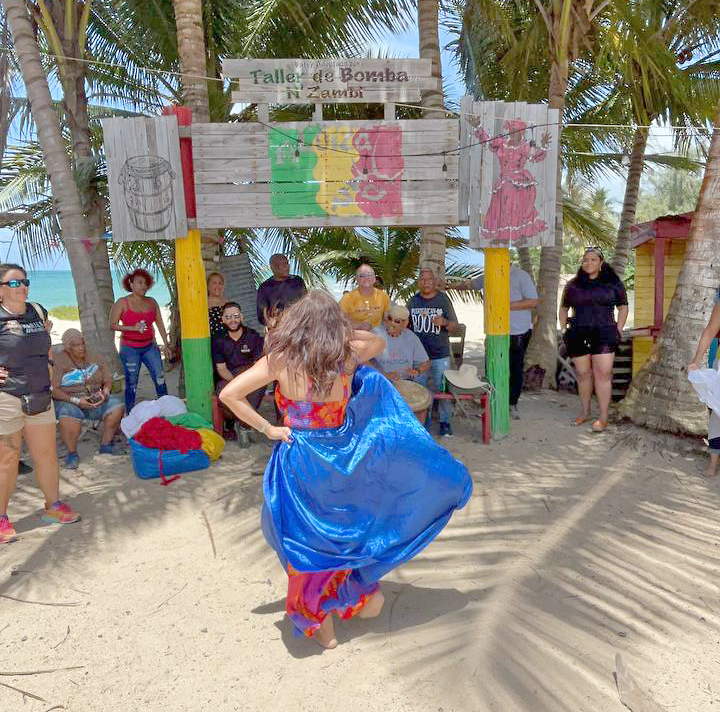 Luego de ver arte y artesanías nuestra última parada fue para ¡bailar! al son de tambores de bomba en el taller N’Zambi. Allí nos recibió Sheila Osorio quien nos dio la bienvenida y nos pidió que hiciéramos una formación circular para enseñar a bailar bomba al grupo de varones y féminas que llegamos al lugar. Le acompañaban tres músicos en los tambores y un cantador. La bomba es considerada por muchos el género musical más antiguo que se conserva hasta nuestros días en Puerto Rico. Es una manifestación que proviene de los legados que los africanos trajeron consigo a los territorios americanos durante la trata transatlántica y los movimientos migratorios de personas negras por las colonias antillanas. La bomba involucra música, canto y baile en vivo. Sheila nos explicó los diversos estilos de baile y toque de bomba según las regiones norte, sur y oeste de Puerto Rico. Luego de repartir coloridas faldas a las mujeres y pañuelos a los hombres Sheila, quien fue formada en el Ballet de los Hermanos Ayala, nos mostró los pasos de los diversos estilos de bomba, los roles de los tambores y cómo entrar al batey o espacio donde se baila. Los tambores se dividen en tambor buleador y tambor primo. El músico del tambor primo ejecuta su toque dando golpes que replican los movimientos que ejecuta el bailador. Como es una especie de conversación se empieza con un saludo que el bailador ofrece al tocador del primo. En Loíza la tradición es que la bomba se baila con los pies descalzos y para mí esto es lo mejor. El batey N´Zambi está al aire libre en el borde de la playa, al lado del puente del río Herrera que separa Loíza de Río Grande, lugar conocido como la Villa Pesquera. Es un espacio abierto de arena, con palmas, un bello paisaje y brisa marina constante. Bailar con pies descalzos en la arena, frente al mar y sintiendo las brisas es una experiencia relajante y liberadora. El lugar también es muy pintoresco con un portal que presenta una gran máscara de vejigante y figuras de bailadoras pintadas por Samuel Lind a quien Sheila reconoce como su padrino. Al entrar al lugar también hay una réplica gigante de un tambor. Este es un hermoso proyecto comunitario y la pasamos de maravilla haciendo conexión con nuestras herencias afroancestrales y nuestra cultura. Para más información: (787) 951-9660 https://www.instagram.com/taller_nzambi/