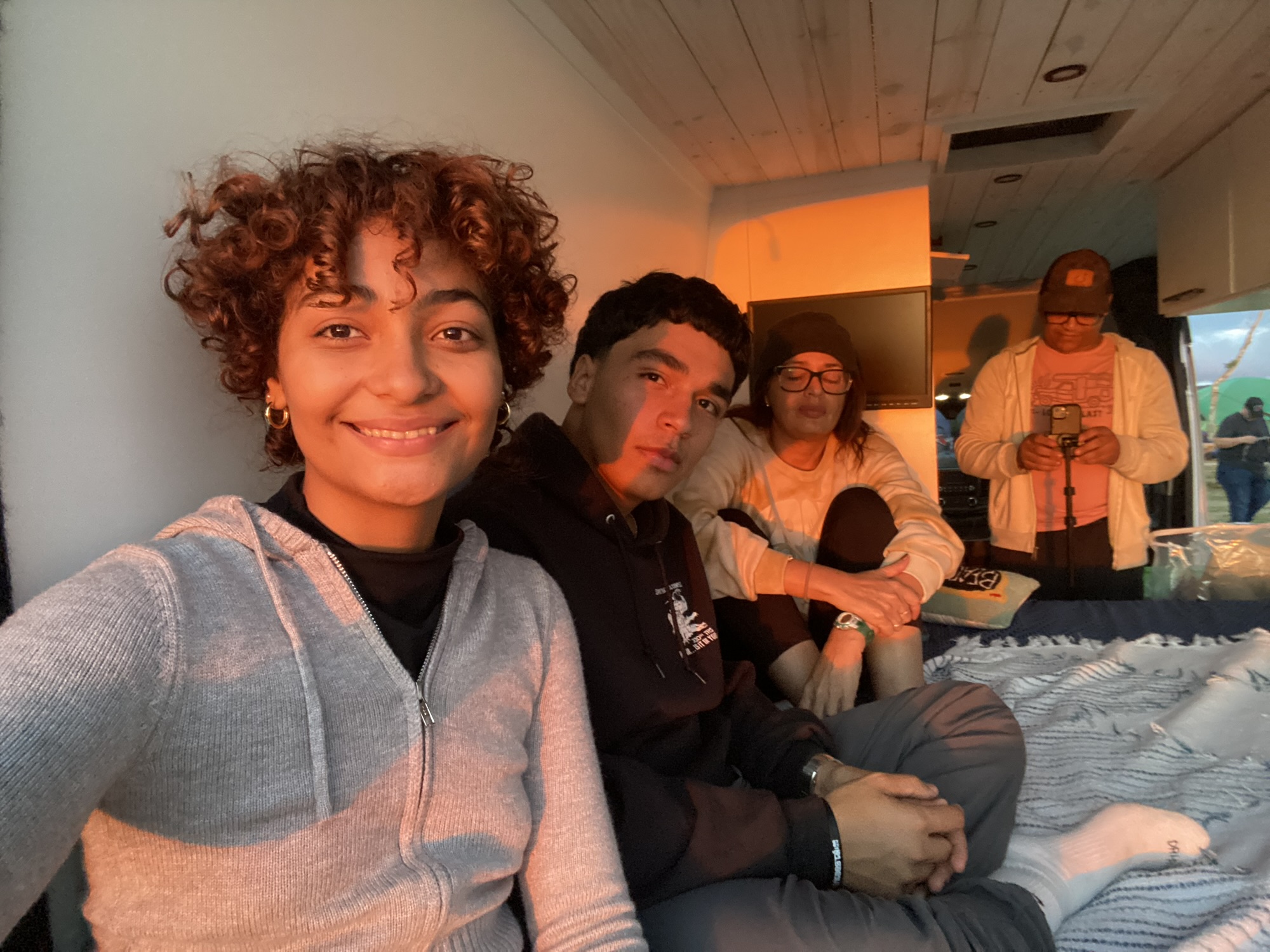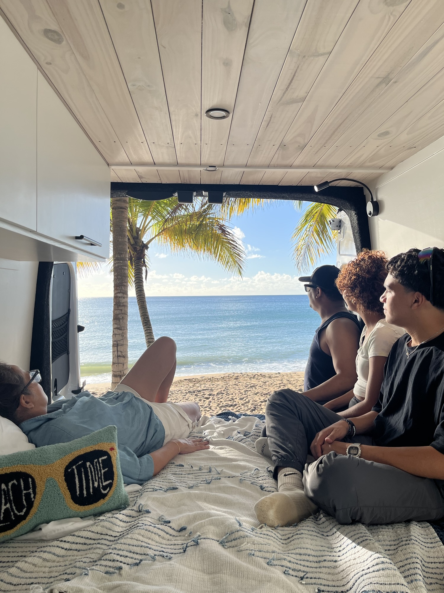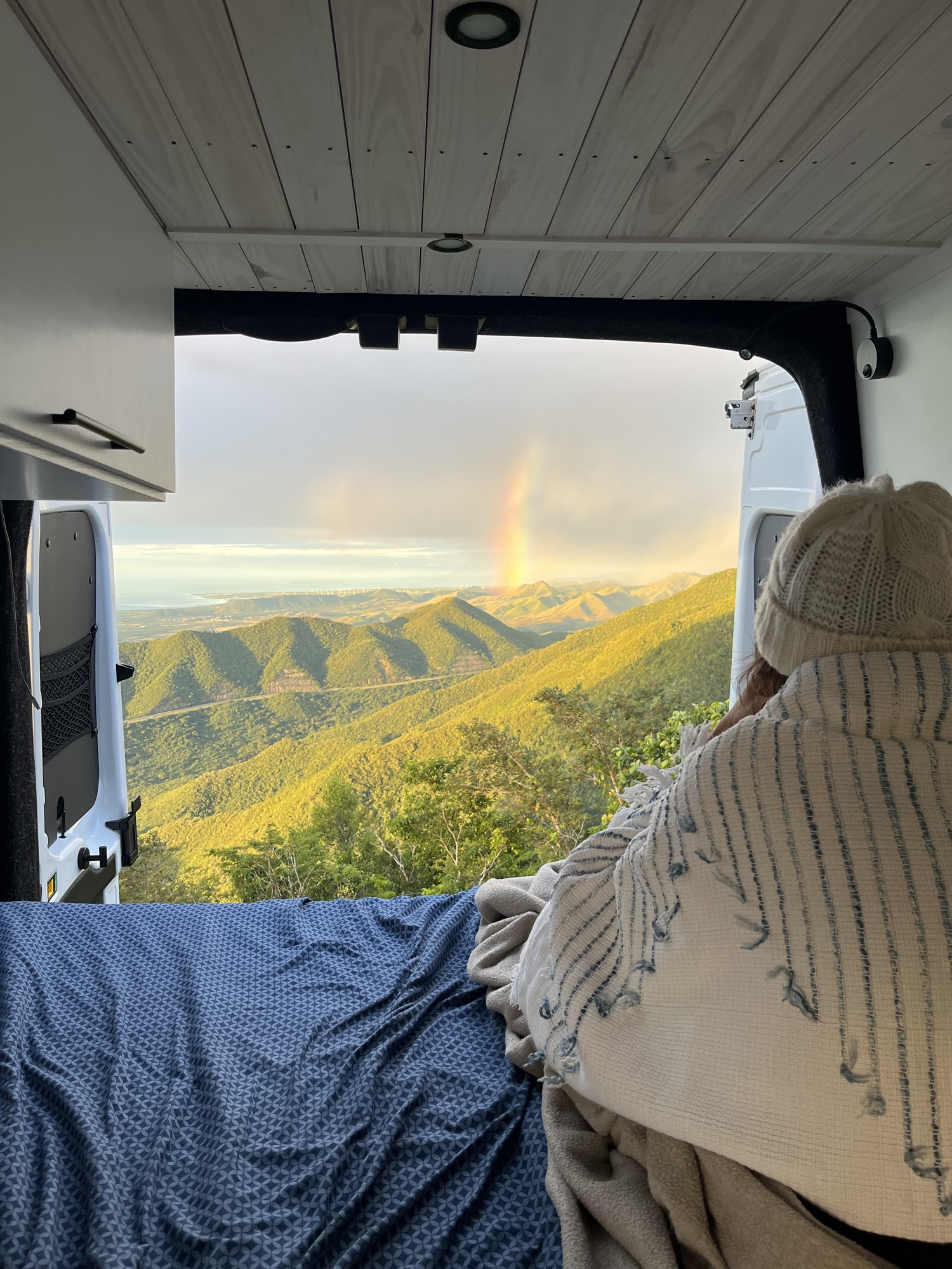Nos montamos en la van llamada Frida, ideal para dos personas pero perfecta para nuestro plan familiar. Nos fuimos a despedir el año a Camping in the Paradise en Cayey, un lugar mágico con vista al sur de la isla. Los niños durmieron en una caseta, pero compartimos todos juntos adentro de la van: viendo atardeceres, el amanecer con un arcoíris, riéndonos, relajándonos. Todo estaba dentro de la van: cama con almohadas y sábanas, inodoro con ducha, cocina con fregadero, tope de hornillas, televisor, nevera eléctrica y utensilios. Acampar con toda esa comodidad nos dio más tiempo para disfrutar el ambiente y compartir. Además de salir al día siguiente de manera más fácil y rápida. Solo tuvimos que guardar la caseta donde durmieron los nenes.