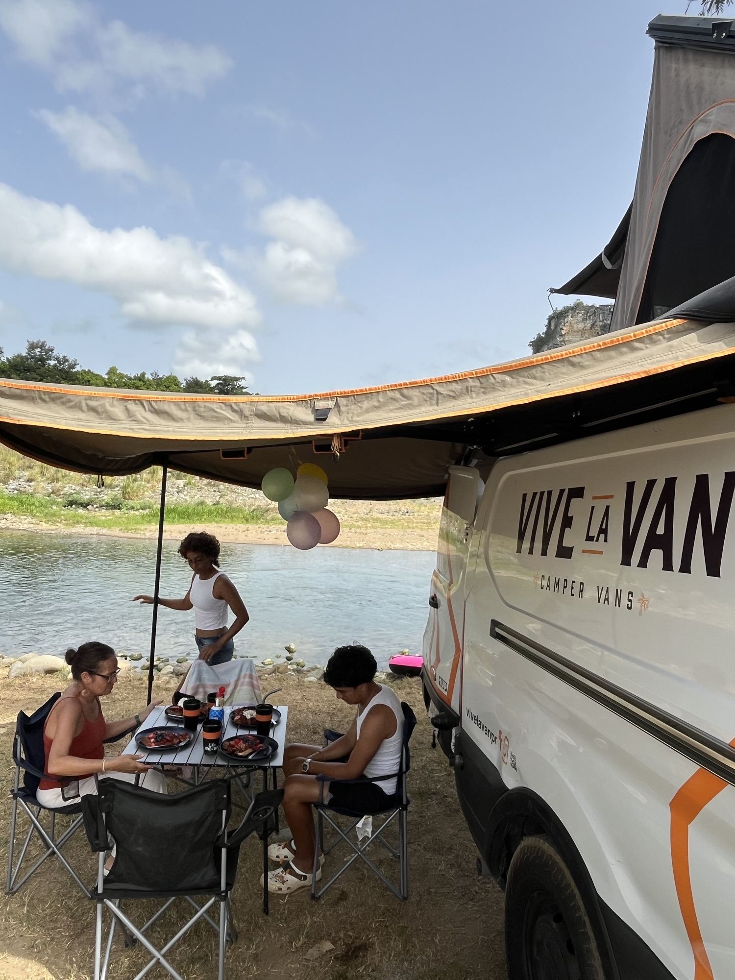 Luego partimos hacia Hacienda Guillermina en Ciales, donde estacionamos la van frente al río y pasamos la tarde rodeados de naturaleza. La TiTo viene equipada con todo lo necesario: BBQ, nevera portátil, utensilios, sillas, mesas, ducha y cómodos espacios para descansar. Los chicos se turnaron las áreas de dormir para experimentar cada rincón de la van.
